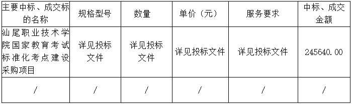 汕尾职业技术学院于2025年11月24日就“汕尾职业技术学院国家教育考试标准化考点建设采购项目”(采购项目编号:SWZYCG2025-17)采用竞争性磋商进行采购。现就本次采购的中标(成交)结果公告如下: