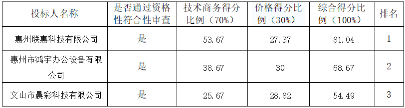 3、有效竞争性磋商的供应商分别是:惠州市鸿宇办公设备有限公司、文山市晨彩科技有限公司、惠州联惠科技有限公司。