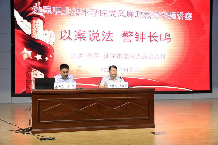为切实加强我校党风廉政建设,增强党员干部党纪政纪法治意识,营造风清气正的良好教育发展环境,2020年7月7日,我校在电教楼学术报告厅举办廉政教育专题讲座,汕尾市监察委员会委员朱军应邀到我校作主题为《以案说法、警钟长鸣》的专题报告。学校党委书记林来平及在家领导班子成员、全体行政教辅人员参加了讲座。讲座由学校党委副书记、纪委书记、工会主席吴方晖同志主持。