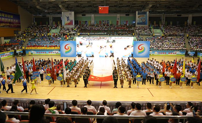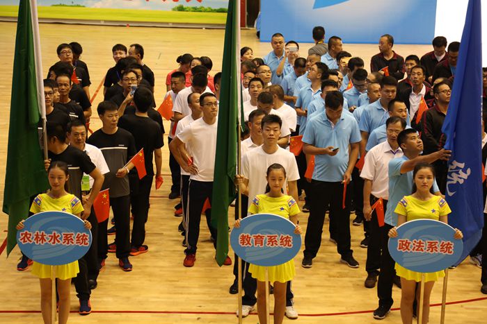 上午9时,由各县(市、区)和市直机关事业单位组成的各代表团,在现场观众的欢呼声中陆续进场,各代表团将参加本届运动会18个大项401个小项的比赛。