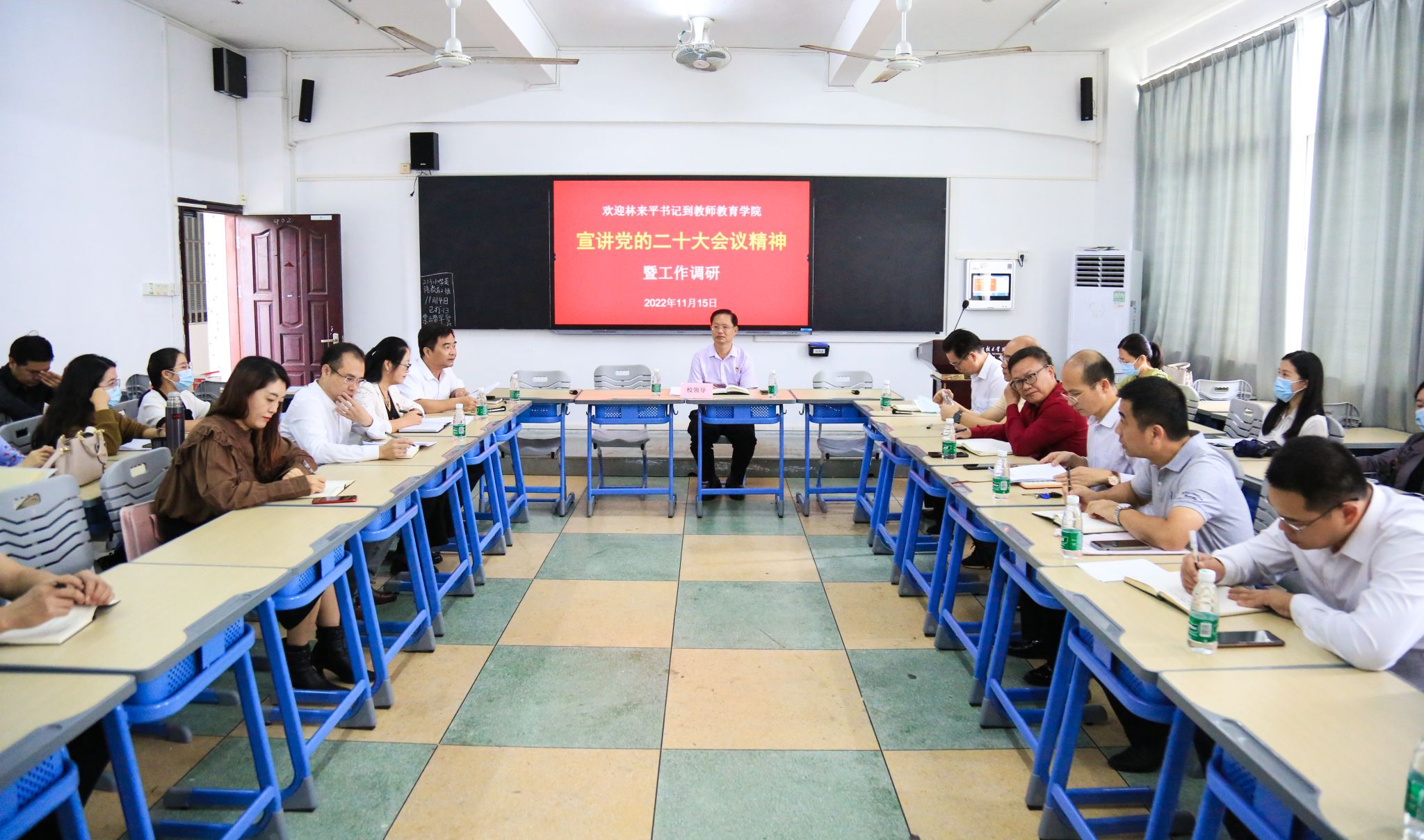 11月15日上午,学校党委书记林来平到教师教育学院调研并宣讲党的二十大精神。学校相关部门负责人陪同调研,教师教育学院领导班子成员、教师代表参加会议。