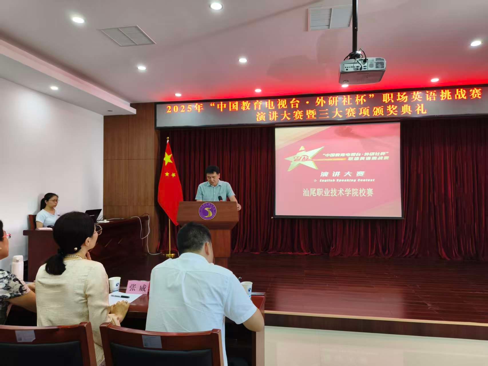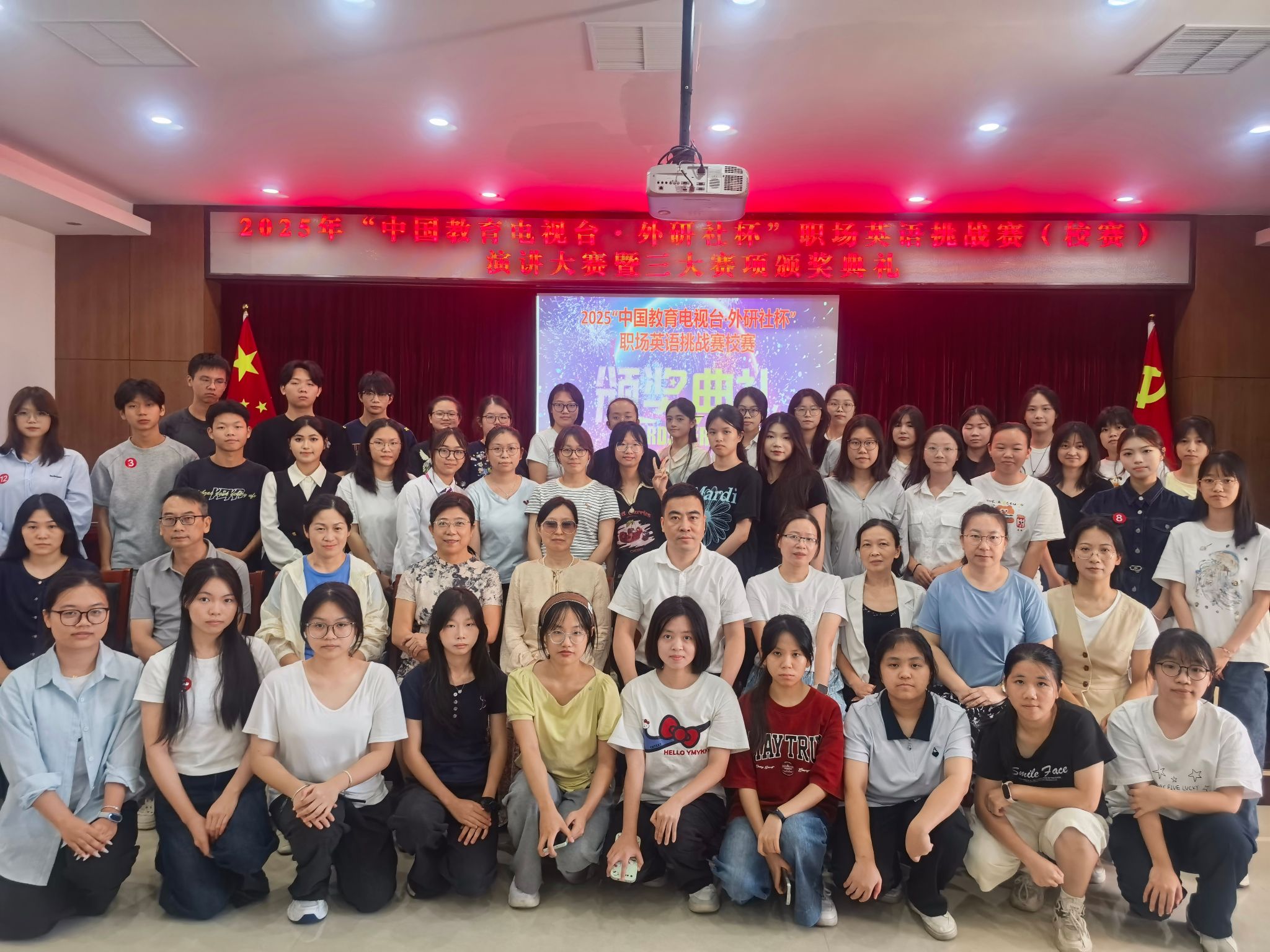10月10日,随着演讲大赛赛项收官战落幕,由学校教务处主办、公共教学学院承办的2025“中国教育电视台・外研社杯”职场英语挑战赛校赛圆满落幕并在科学楼四楼会议室隆重举行三大赛项颁奖典礼。现场氛围庄重热烈,教务处、公共教学学院相关负责人,评委老师和获奖学生齐聚一堂,共同见证赛事成果,为获奖选手喝彩。