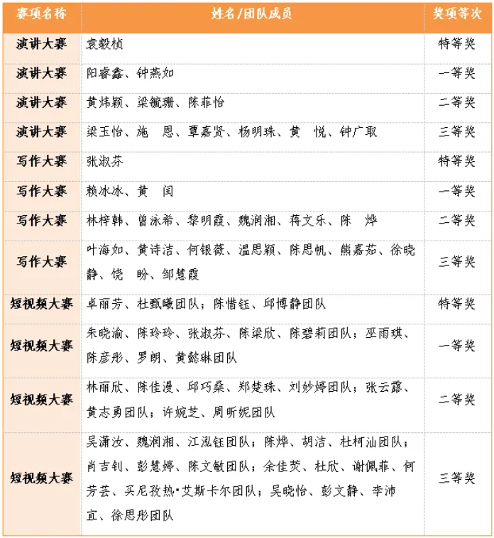 经过多轮评审与综合评定,三大赛项最终评选出特等奖、一等奖、二等奖、三等奖若干。其中,袁毅桢同学凭借出色的现场表现斩获演讲大赛特等奖;张淑芬同学以扎实的书面表达能力摘得写作大赛特等奖;卓丽芳团队(成员:杜甄曦)、陈惜钰团队(成员:邱博静)凭借富有创意与深度的作品,共同荣获短视频大赛特等奖。(其他获奖名单见附表)