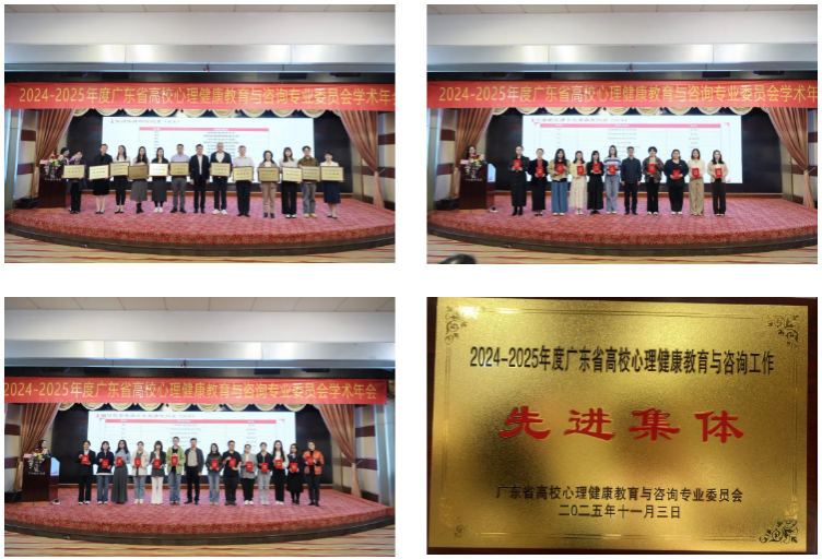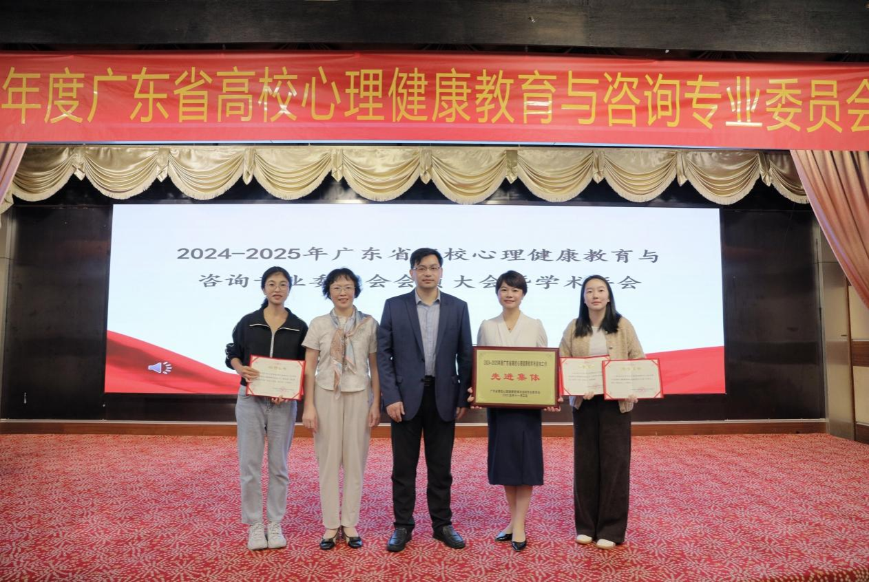 我校荣获2024-2025年度心理健康教育与咨询工作“先进集体”称号;彭丹蕾荣获广东省高校心理健康教育和咨询“优秀中心主任”称号;李乐荣获广东省高校心理健康教育和咨询工作(专兼职心理咨询老师类)“先进个人”称号;陈伟嘉荣获广东省高校心理健康教育和咨询工作(辅导员及二级心理辅导站老师类)“先进个人”称号。