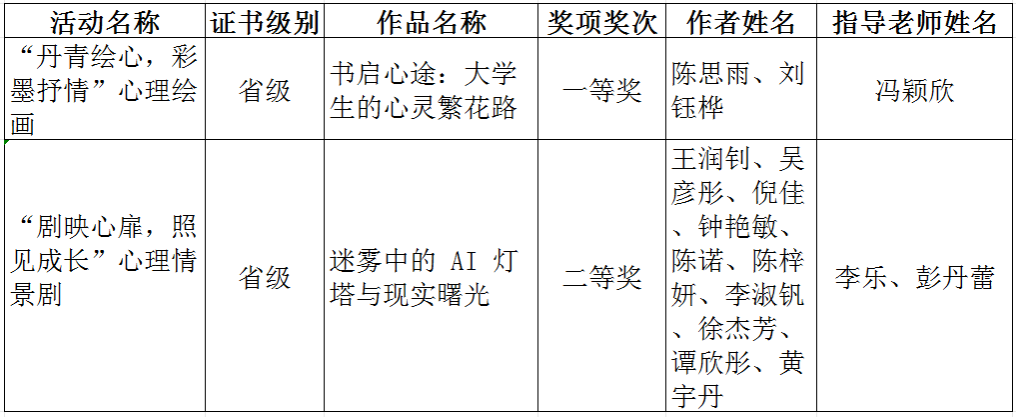 此外,省教育厅公布2025年“5•25”大学生心理健康月系列活动获奖名单,我校师生报送的作品荣获一等奖1项、 二等奖1项。陈思雨、刘钰桦同学的作品《书启心途:大学生的心灵繁花路》荣获心理绘画类一等奖,以细腻笔触勾勒大学生心灵成长的轨迹,传递出对自我探索与心灵绽放的深刻感悟。王润钊、吴彦彤等同学创作的《迷雾中的AI灯塔与现实曙光》荣获心理情景剧类二等奖,作品讲述主角在AI助手与心理咨询的帮助下,从逃避社交到学会自我接纳的成长历程,探讨了科技、自我力量和社会支持在克服社交恐惧中的平衡。