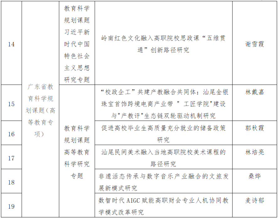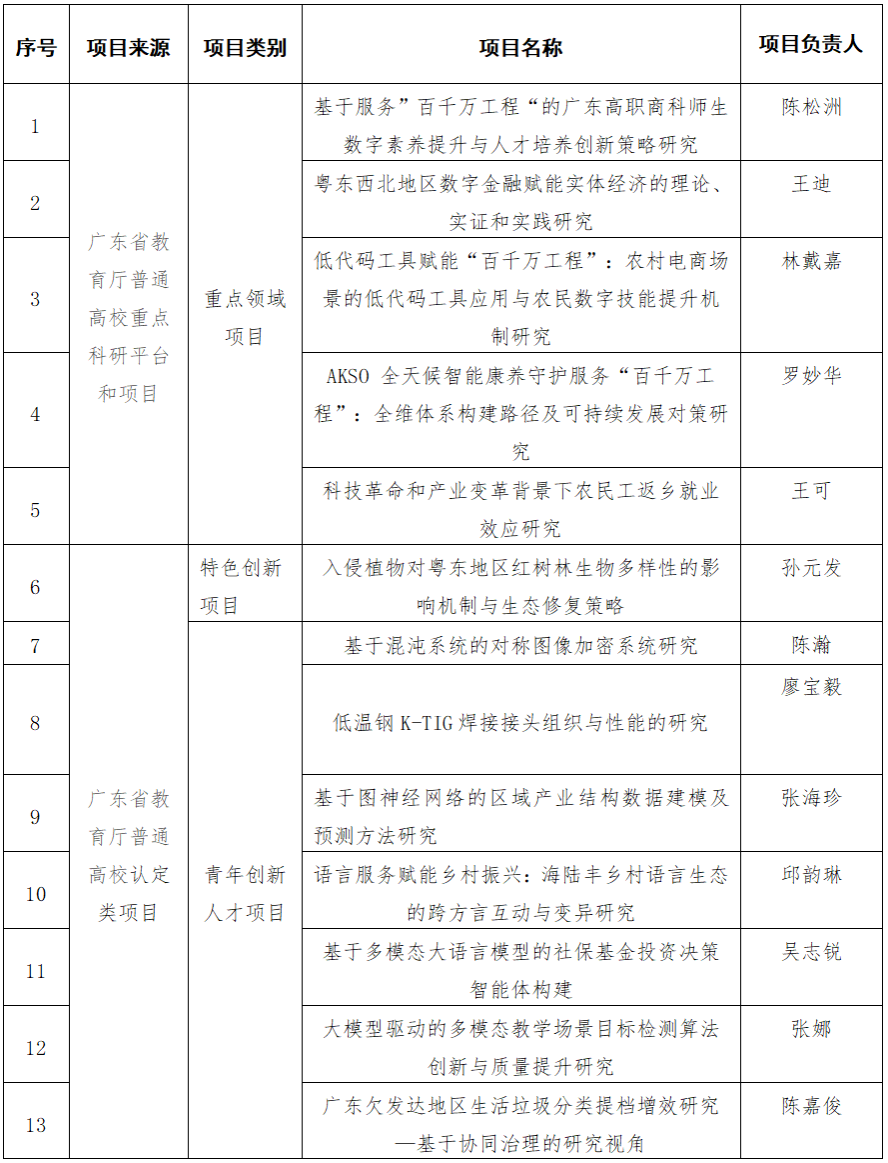 近日,根据《广东省教育厅关于公布2025年度普通高校重点科研平台和项目立项名单的通知》(粤教科函〔2025〕9号)、《广东省教育厅关于公布2025年度普通高校认定类科研项目立项名单的通知》(粤教科函〔2025〕10 号)和《广东省教育科学规划领导小组办公室关于公布2025年度教育科学规划课题(高等教育专项)立项名单的通知》,我校共19项科研项目获准立项。其中获准立项广东省普通高校重点领域专项—服务“百千万工程”重点领域专项5项、广东省普通高校特色创新类项目1项、广东省普通高校青年创新人才类项目7项;获得批准教育科学规划课题(高等教育专项)立项研究6项,其中习近平新时代中国特色社会主义思想研究专题1项、高等教育科学研究专题6项(详见下表)。在粤东地区同类院校中获立项数居于前列,体现了我校在科研建设方面的持续进步。