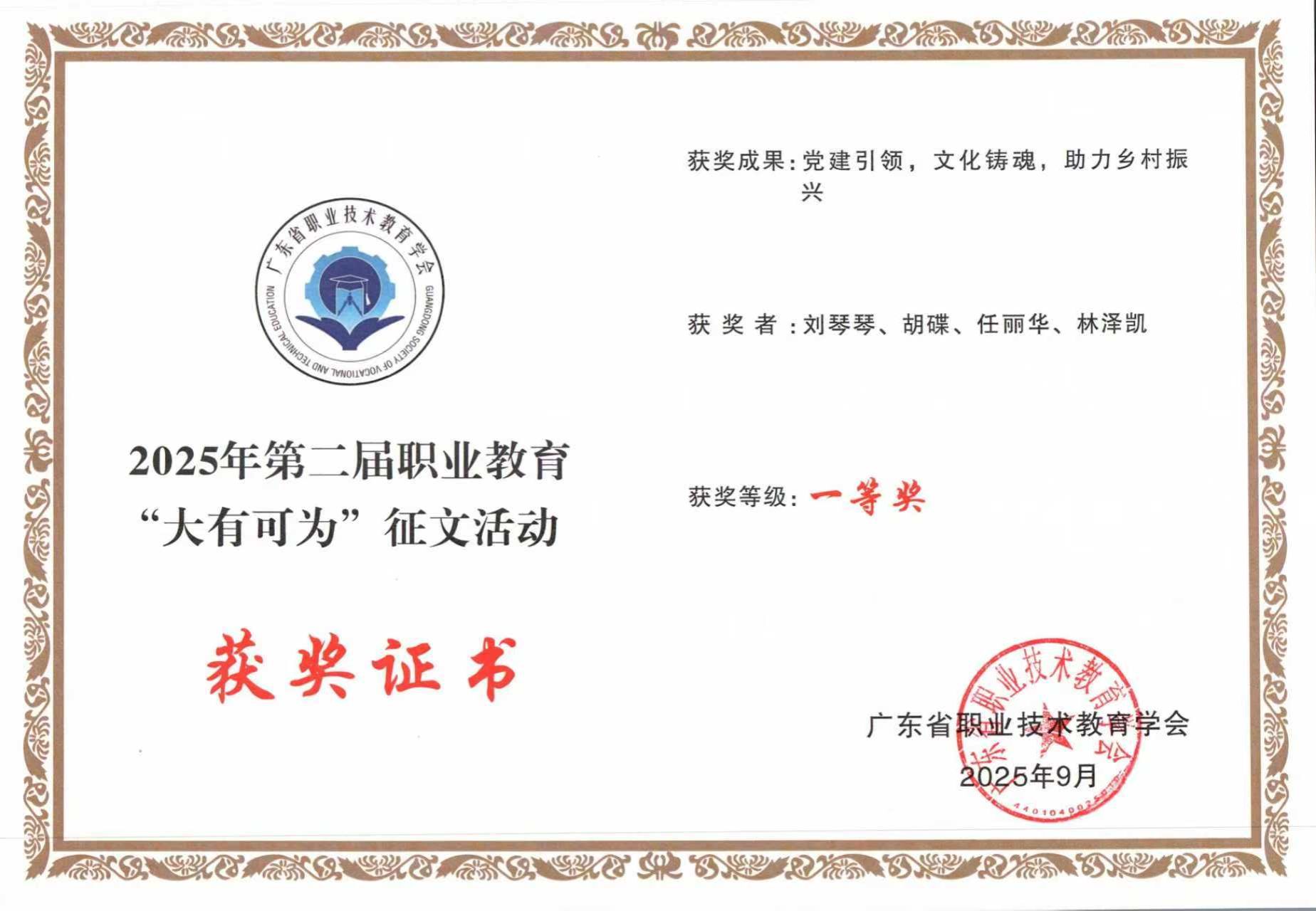 近日,2025年第二届职业教育“大有可为”征文活动获奖名单正式揭晓。经专家严格评审,我校人文学院教师团队撰写的《党建引领,文化铸魂,助力乡村振兴》凭借深刻的理论洞察与扎实的实践探索,荣获一等奖,充分彰显了我校在职业教育与乡村振兴融合领域的理论创新实力与实践示范成效。