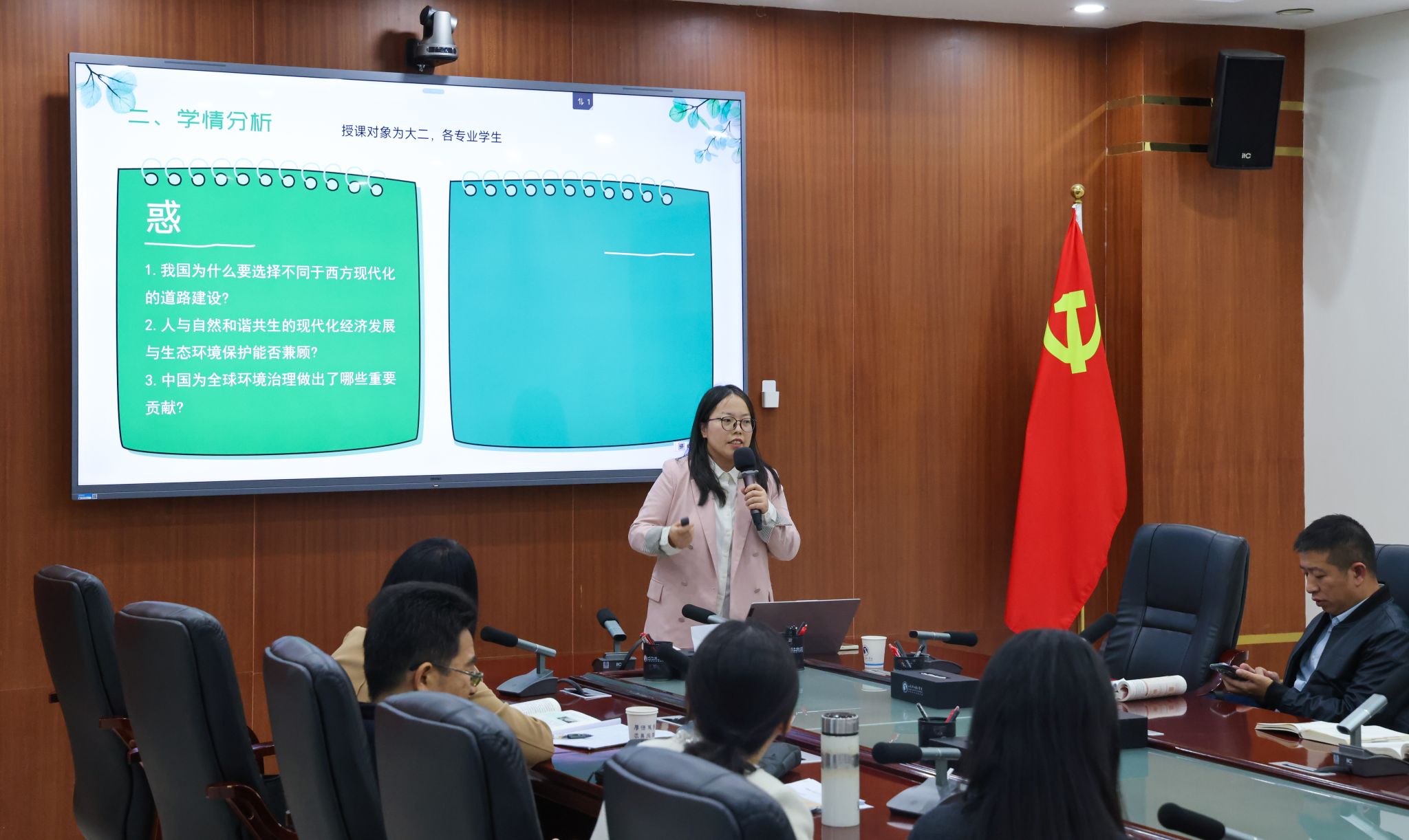 在集体备课环节,马克思主义学院教师龚林林以“绿水青山就是金山银山”为主题开展示范教学,龚林林从绿水青山就是金山银山为何提出、绿水青山就是金山银山深刻内涵、把生态文明建设摆在全局工作的突出位置三个角度进行讲授。与会教师围绕教学内容、授课方法等展开深入研讨,现场交流研讨氛围热烈。