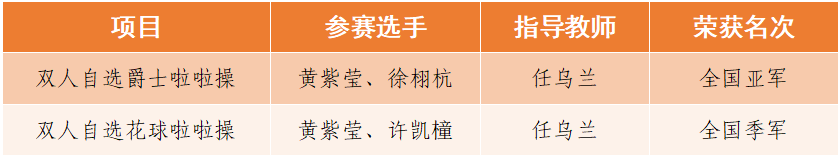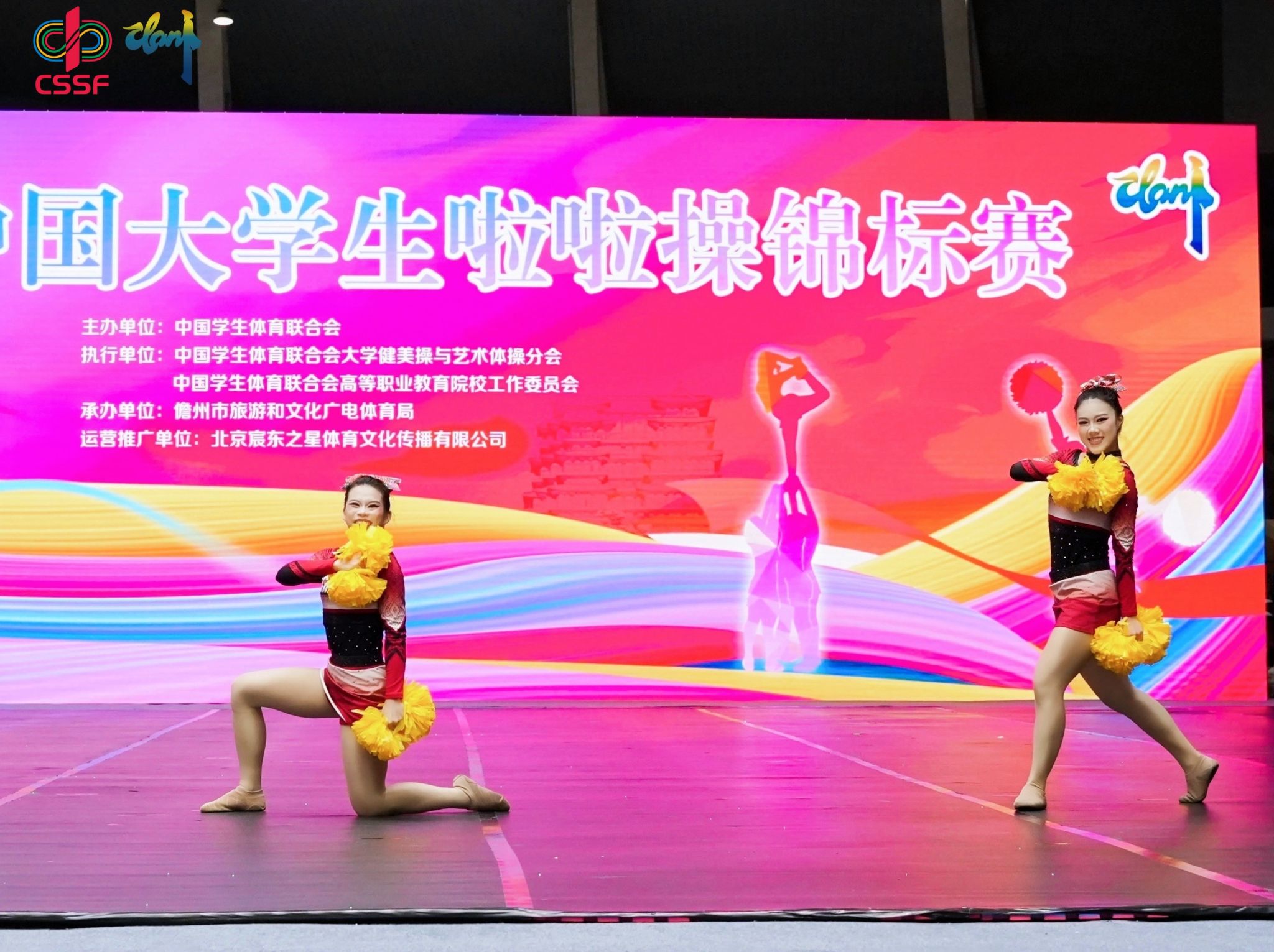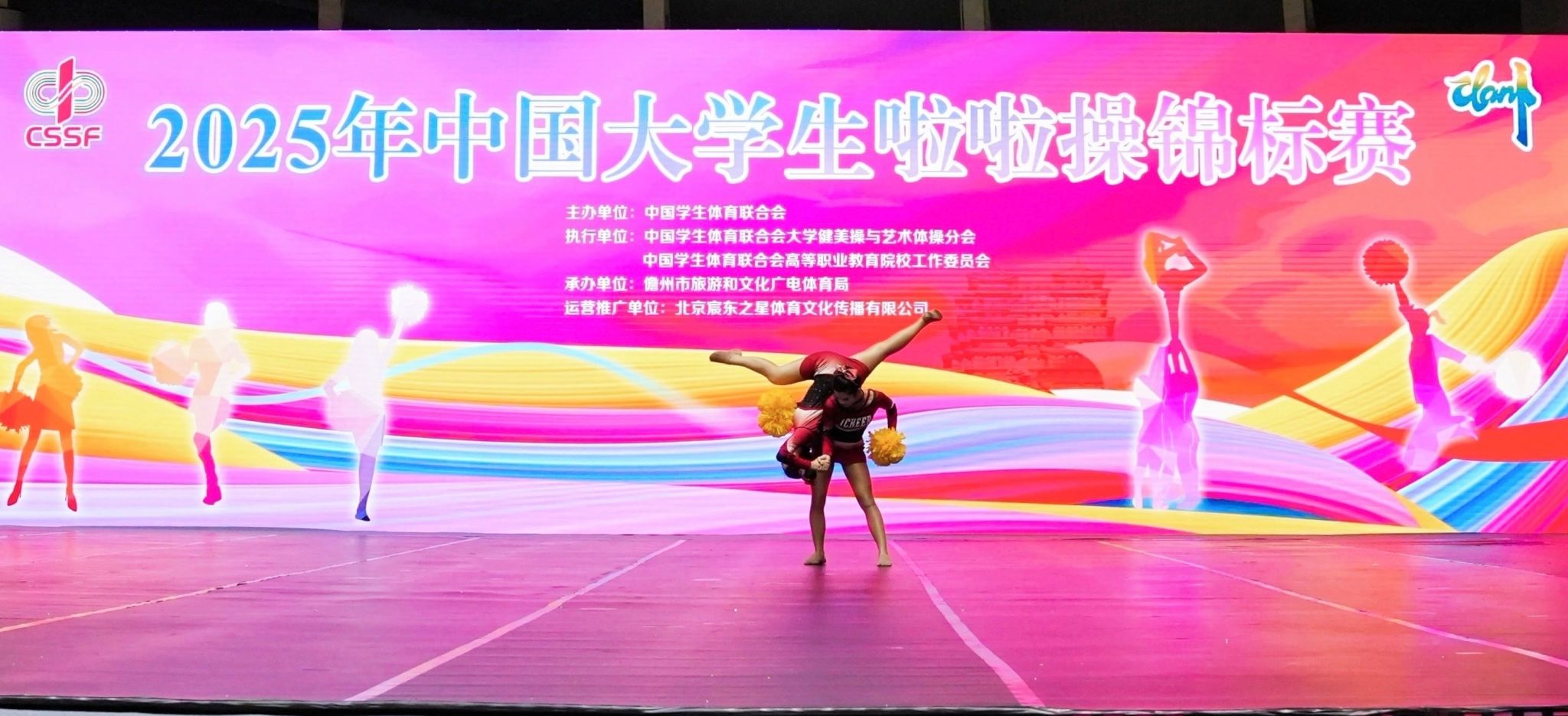 2025年中国大学生啦啦操锦标赛于11月12日至17日在海南省儋州海花岛国际会展中心圆满落幕。作为国内啦啦操领域的顶级赛事,本次赛事由中国学生体育联合会主办,吸引了来自全国各省、市、自治区的千余名高水平运动员齐聚一堂,展开了一场兼具力量与美感、激情与协作的巅峰对决。我校啦啦操队首次亮相全国赛场便惊艳全场,凭借精准巧妙的动作编排、饱满昂扬的精神风貌和稳定出色的现场发挥,在乙A组(高职高专组)双人自选爵士啦啦操和双人自选花球啦啦操两个项目中强势勇夺佳绩,分别荣膺全国亚军、全国季军,为学校赢得了沉甸甸的荣誉。