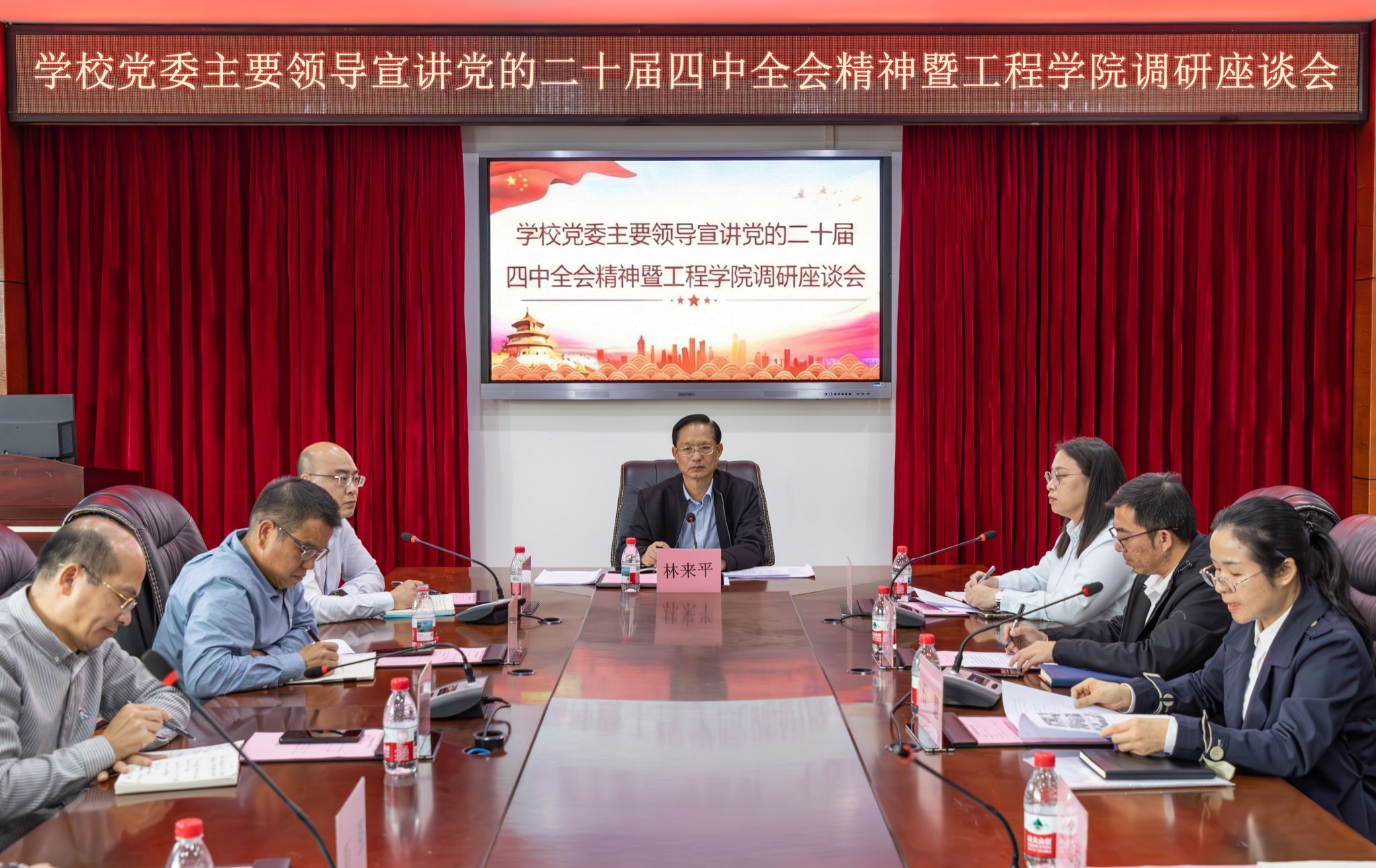 12月4日下午,学校党委书记林来平带队深入工程学院宣讲党的二十届四中全会精神并召开调研座谈会。学校办公室、组织人事处、后勤管理处、教务处、学生处、科研处等相关职能部门负责人,工程学院党政班子成员及全体无课教师参加会议。学校党委委员、办公室主任麦永豪主持会议。