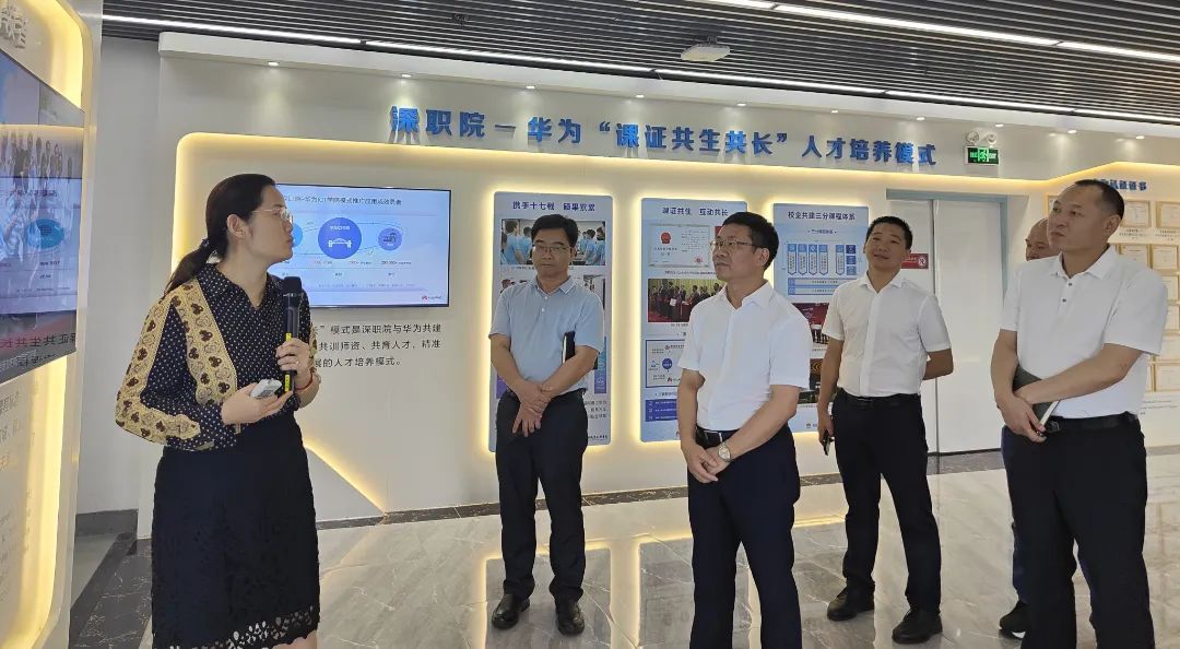 在深圳职业技术大学领导的陪同下,蔡昭权一行参观了深圳职业技术大学比亚迪应用技术学院、传播工程学院实训中心、华为ICT学院实训平台、崇理书院等场所。