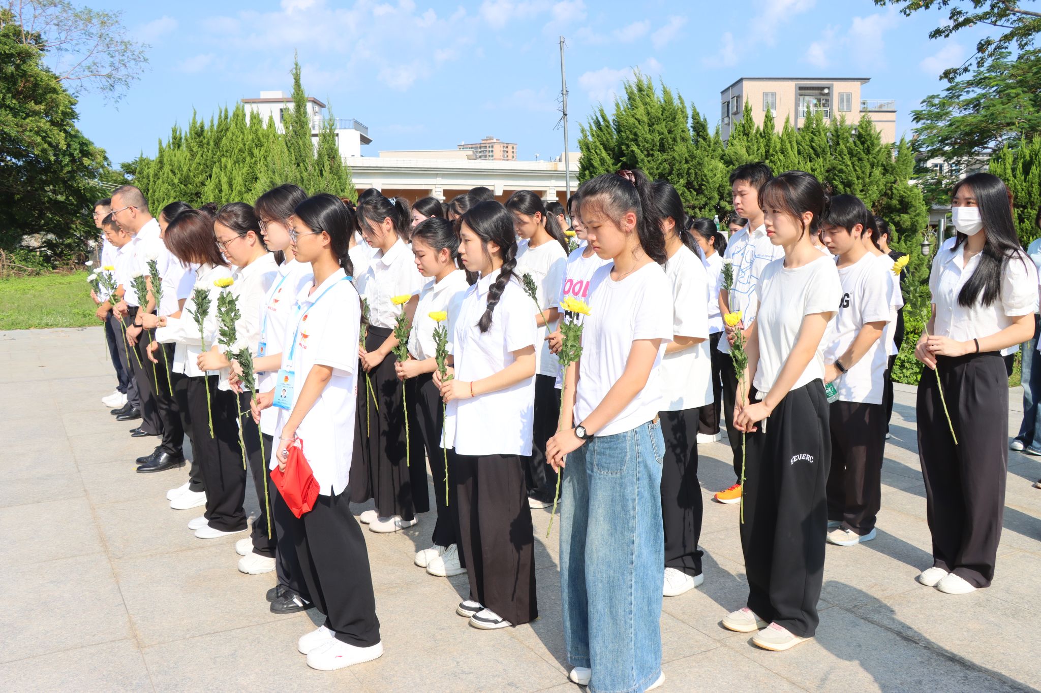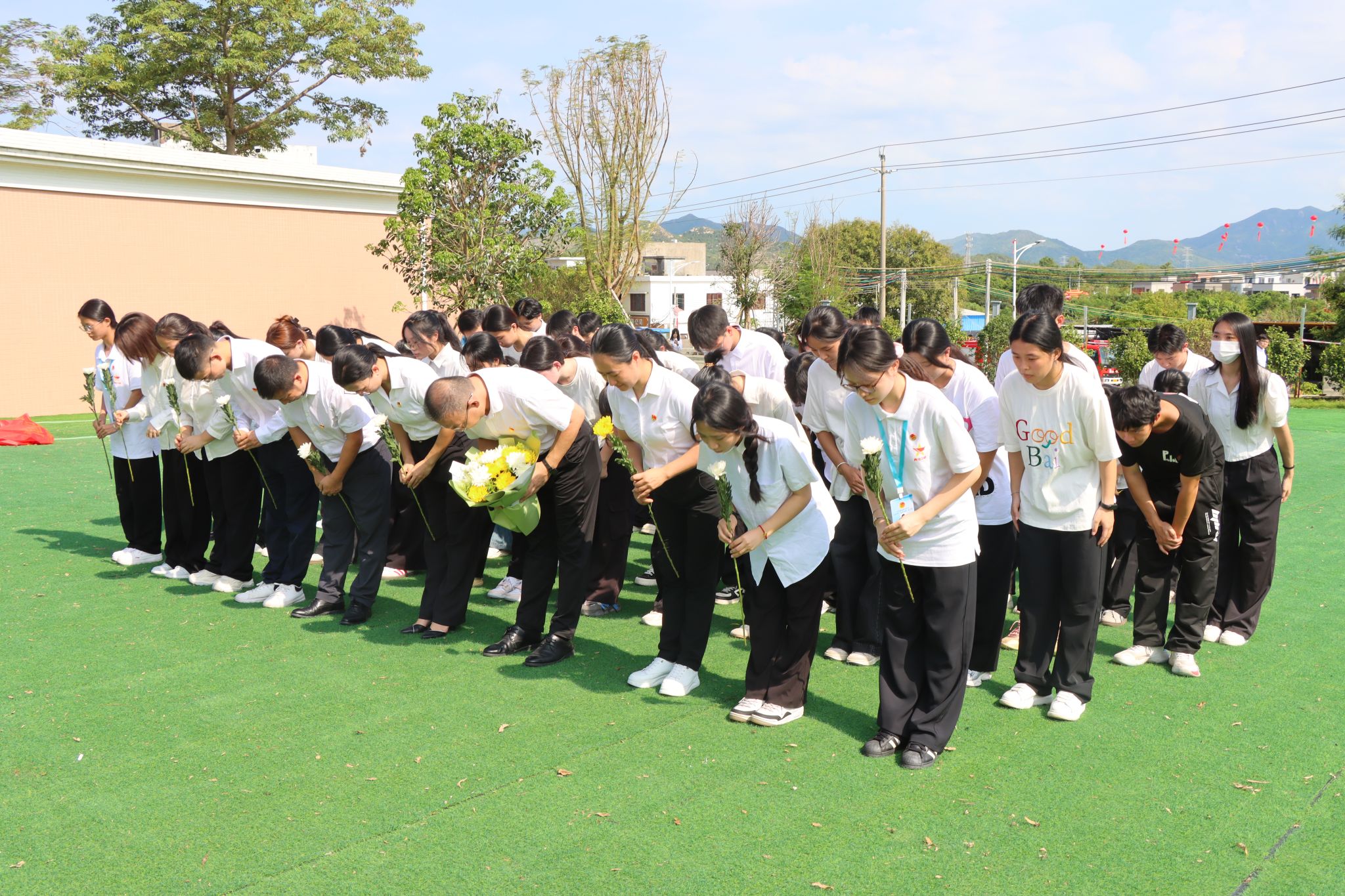 随后,师生们依次缓步上前,向烈士纪念碑敬献鲜花。一朵朵菊花轻放碑前,仿佛一声声低语:山河已如愿,吾辈正前行。