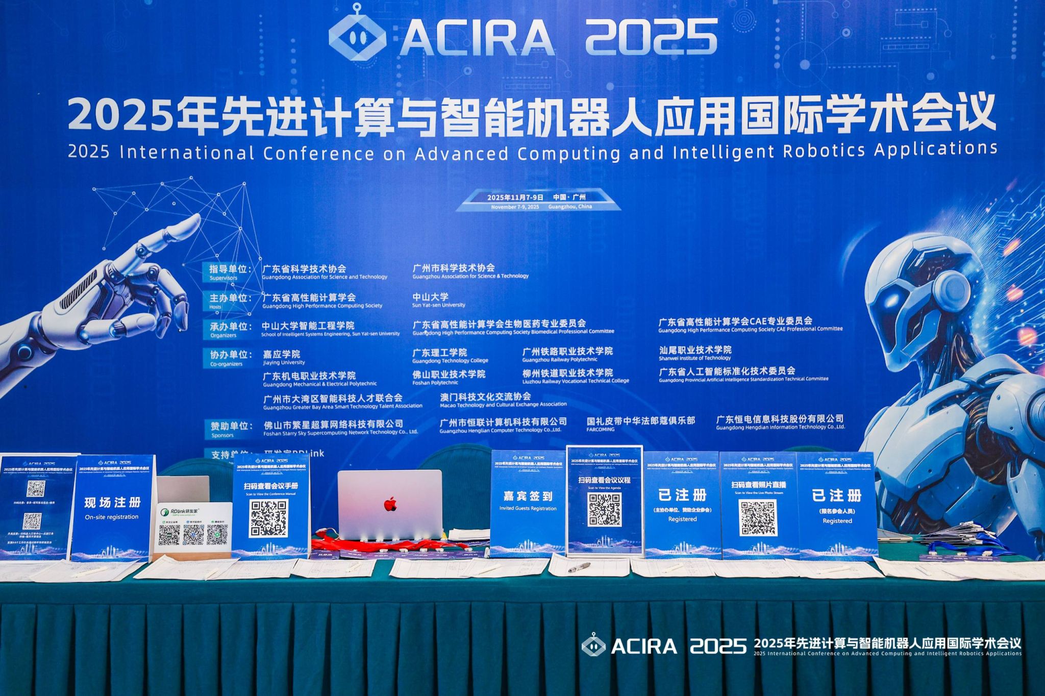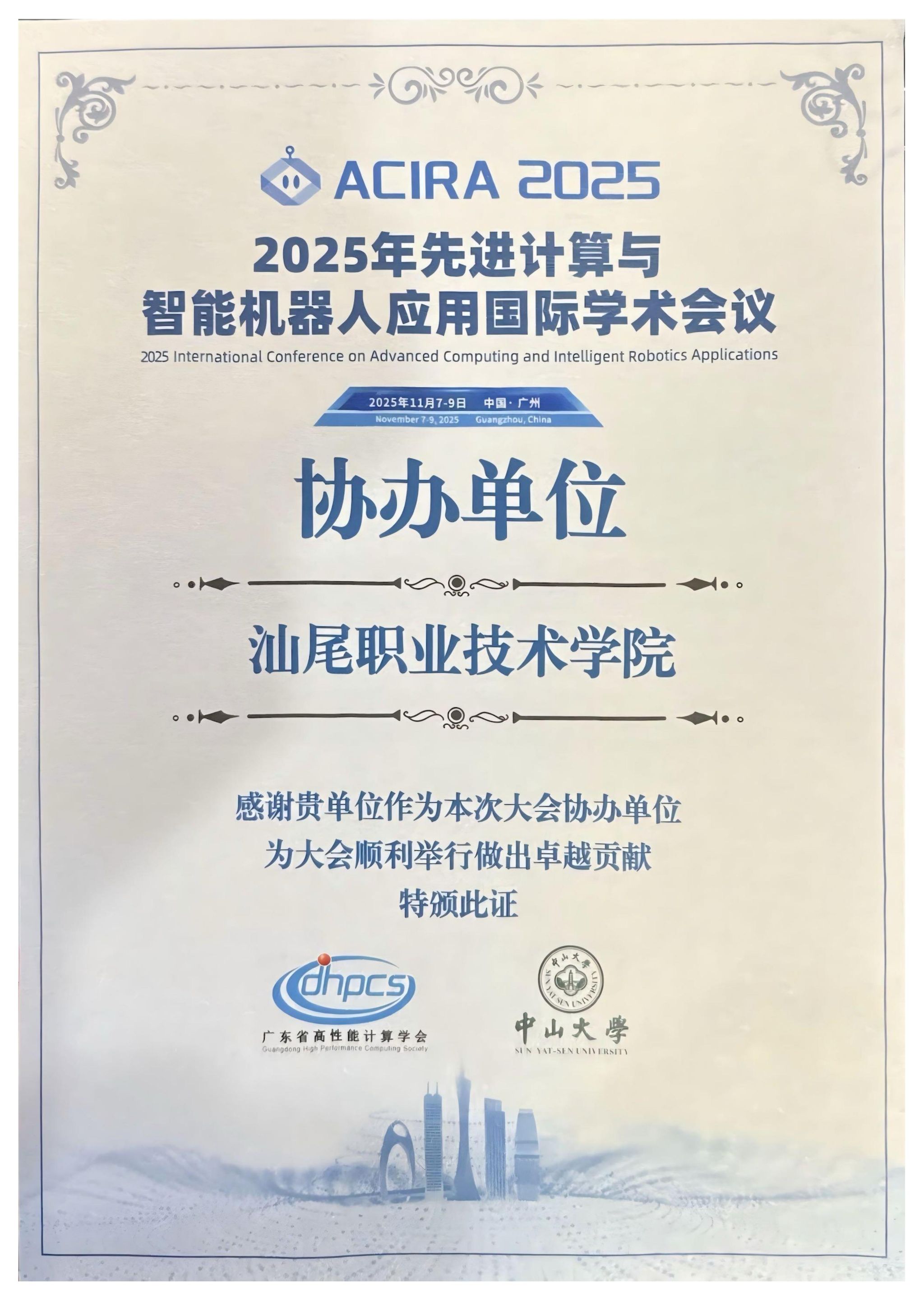 2025年11月7日至9日,由广东省高性能计算学会与中山大学联合主办的“2025年先进计算与智能机器人应用国际学术会议(ACIRA 2025)”在广州举行。我校作为会议协办单位之一,工程学院、海洋学院积极参与了此次国际学术盛会的组织筹备与学术交流工作,并派出骨干教师团队深度参与学术交流。